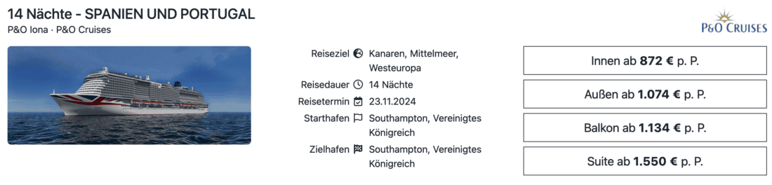Das Kreuzfahrtschiff Iona von P&O Cruises ist im November 2024 auf einer zweiwöchigen Kreuzfahrt in Richtung Spanien und Portugal unterwegs. Die Abfahrt erfolgt dabei in Southampton. Wer Lust hat, dem tristen Herbstwetter in Deutschland zu entfliehen, der kann sich eine Innenkabine auf dieser Reise aktuell schon ab 872€ pro Person sichern. Für einen moderaten Aufpreis stehen auch Außenkabinen ab 1.074€ sowie Balkonkabinen ab 1.134€ zur Verfügung (jeweils pro Person bei Doppelbelegung).