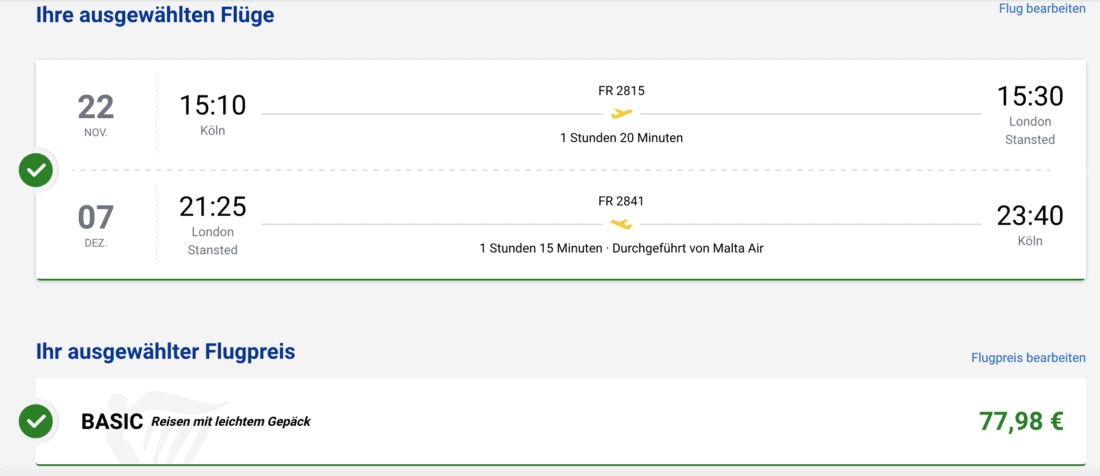 Die Kreuzfahrt startet und endet in Southampton. Deshalb sind für die An- und Abreise Flüge zu einem der Airports im Großraum London zu empfehlen. Ein Beispiel sind Flüge mit Ryanair von Köln mit Abflug am 22. November und Rückflug am 7. Dezember 2024. Aktuell ist diese Verbindung ab 78€ (+47€ für 20 kg Aufgabegepäck) buchbar: