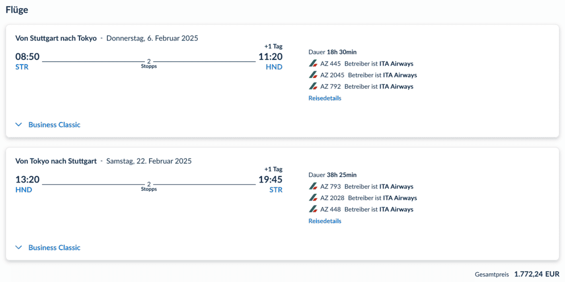 Die Langstrecke nach Tokio bietet ITA ausschließlich von Rom an. Theoretisch gibt es Direktflüge ab Frankfurt & München. Allerdings haben diese meist einen langen Aufenthalt in Rom, sodass die ITA-Website oft nur Verbindungen mit 2 Umstiegen ausspuckt.