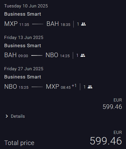 Von Mailand nach Manama (Bahrain) fliegt ihr im Airbus A321neo mit Lie-Flat Bestuhlung (2-2). Teilweise gibt es noch einen zusätzlichen Stopp in Rom. Ein passendes Review findet ihr z.B. hier. Weiter nach Nairobi geht es dann im Airbus A320neo mit Recliner Sitzen (2-2).