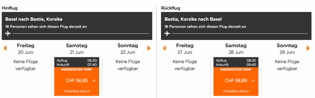 Die An- und Abreise ist nicht im Preis enthalten. Der nächstgelegene Flughafen ist der Airport von Calvi. Deutlich besser ist allerdings der Flughafen von Bastia angebunden. Hier könnt ihr beispielsweise passende Flüge mit Easyjet im Zeitraum vom 21. bis 28. Juni 2025 von Basel ab 116 CHF (~126 €) (zzgl. 122 CHF (~132 €) für 23 kg Aufgabegepäck) buchen:
