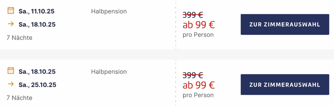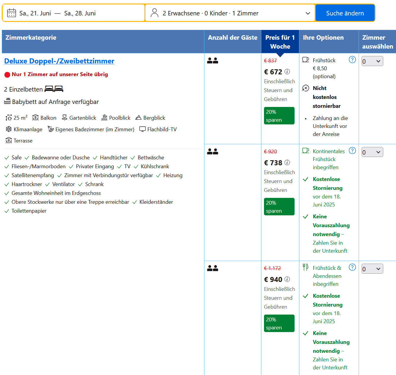 Während ihr bei Berge & Meer im Beispiel 21. bis 28. Juni insgesamt 198€ bezahlt, müsst ihr bei anderen Anbietern für die Rate mit Halbpension schon 940€ auf den Tisch legen. Da kann man eigentlich nicht meckern. Vergleicht eure Wunschdaten aber am besten noch mal selbst.