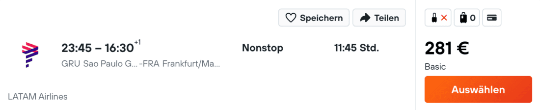 Aktuell verkauft LATAM günstige Oneway-Flüge von São Paulo nach Frankfurt. Ihr könnt euch Tickets auf dieser Strecke bereits ab 281€ sichern. Der günstigste Preis im Tarif Economy Light beinhaltet lediglich 1 Personal Item sowie ein Handgepäckstück bis 10 kg. Falls ihr auch Aufgabegepäck benötigt, so könnt ihr direkt bei LATAM den Tarif Economy Standard ab 359€ buchen. Verfügbarkeiten konnten wir im Reisezeitraum von Oktober bis Dezember 2024 finden.