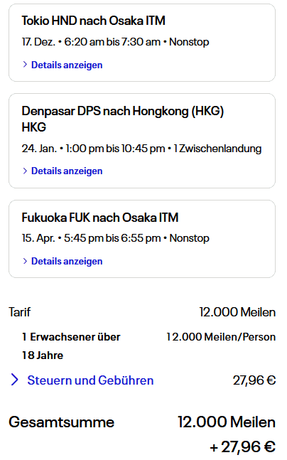 - Segment 1: Tokio – Osaka mit ANA für 6.000 Meilen + 3€