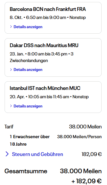- Gesamtpreis bisher: 38.000 Meilen + 183€