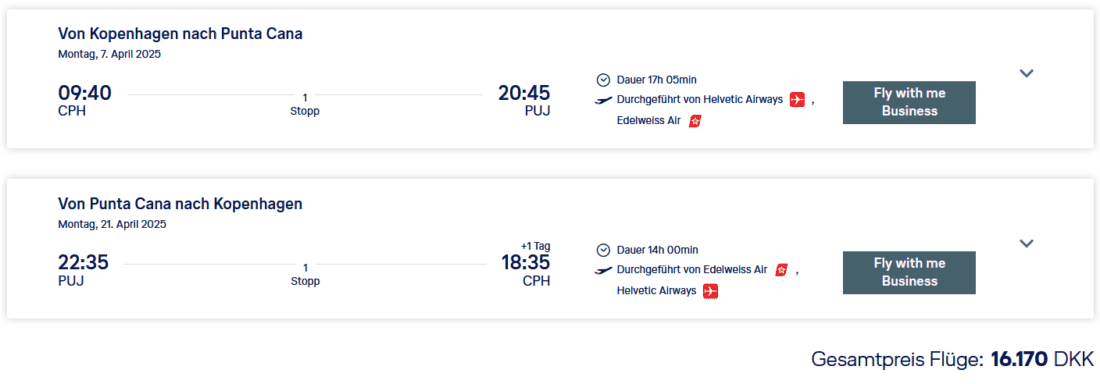 Von Kopenhagen aus geht es mit den Ferienfliegern Discover Airlines und Edelweiss ab nur 8.085 DKK (~1.083 €) pro Person nach Punta Cana und zurück. Verfügbarkeiten lassen sich von Januar bis Juni 2025 finden, am besten sieht es im Mai und Juni aus. Der Abflug von Oslo ist ebenfalls möglich, aber rund 100€ p.P. teurer.