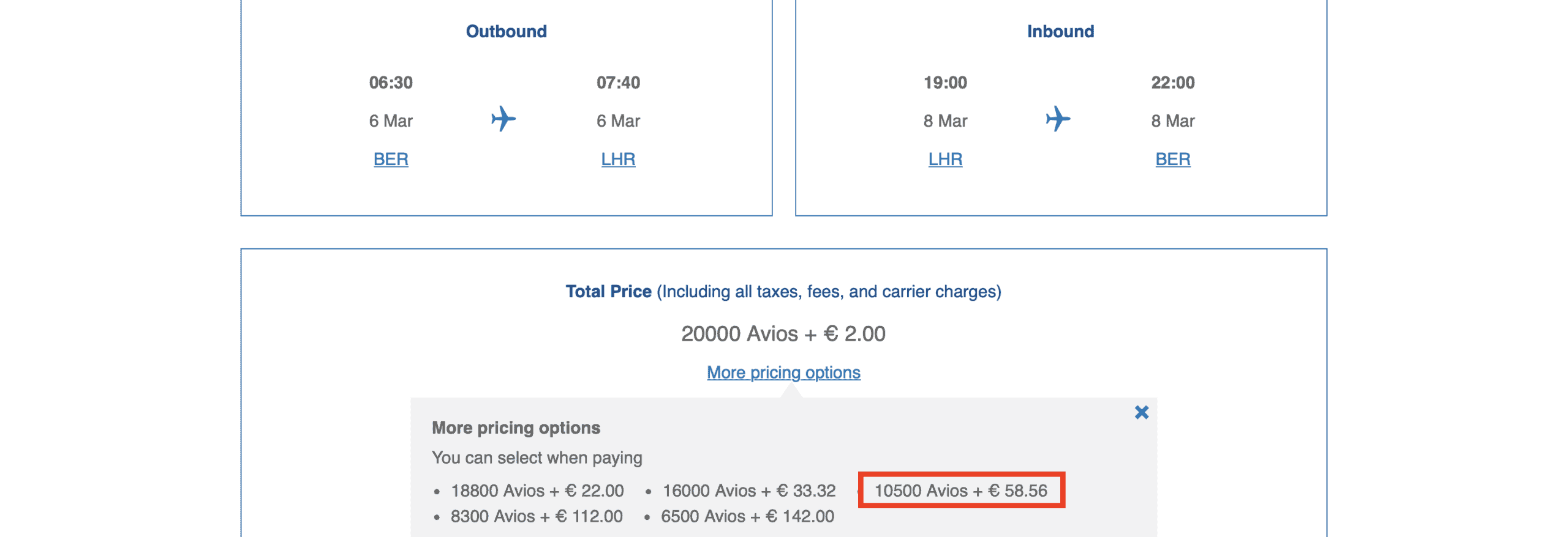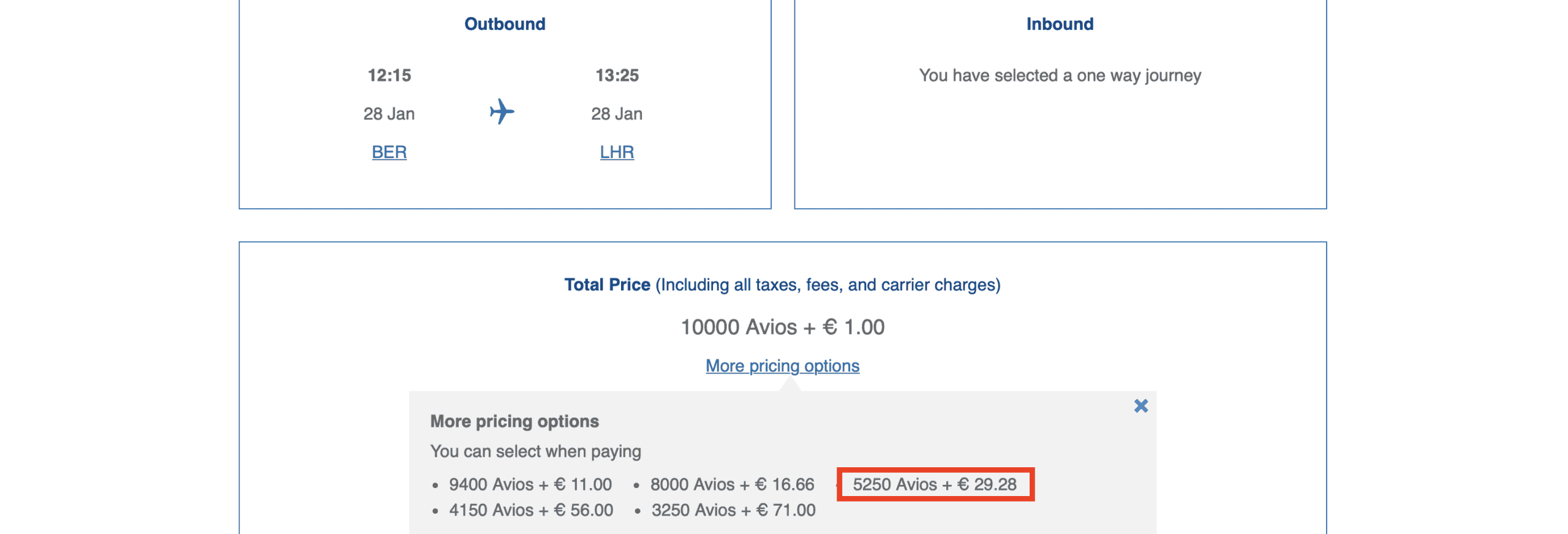 Um das meiste aus euren Meilen rauszuholen, solltet ihr diese Option vermeiden. Den besten Wert pro Avios erzielt ihr mit der Option für 23€ Steuern & Gebühren pro Richtung.