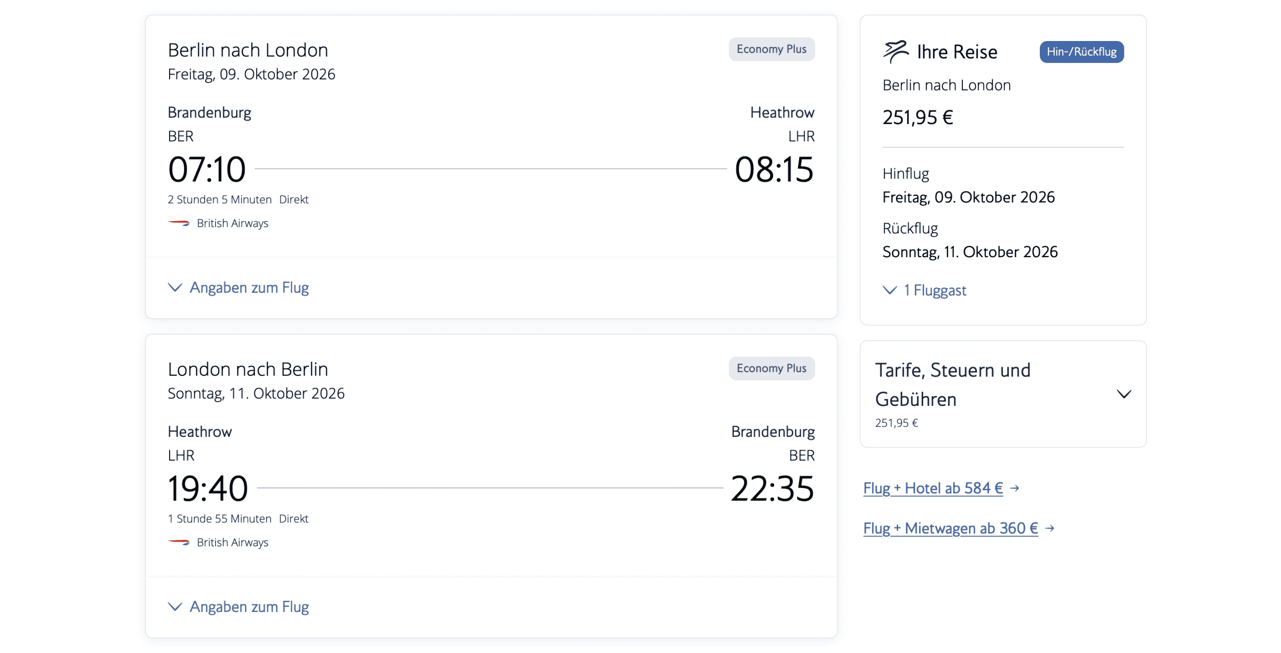 Bucht man obigen British-Airways-Flug auf konventionellem Weg, findet man folgende Konditionen vor: