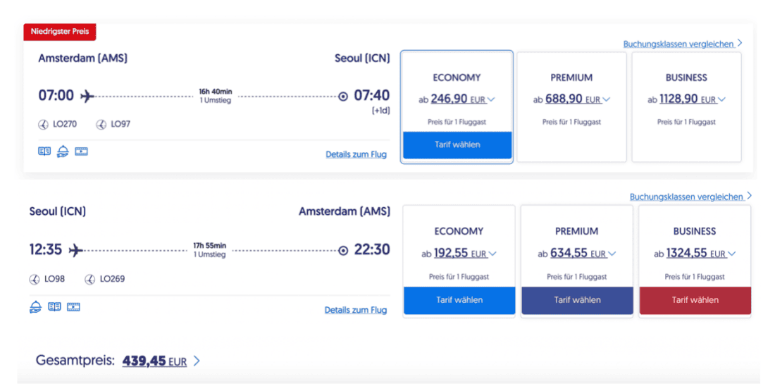Das polnische Star-Alliance-Mitglied LOT verkauft aktuell günstige Tickets auf der Route von Amsterdam nach Seoul. Falls ihr bereit seid, in den Niederlanden abzufliegen, so könnt ihr euch den Hin- und Rückflug bereits ab 440€ sichern. In diesem Preis sind lediglich 8 kg Handgepäck enthalten. Verfügbarkeiten gibt es im Reisezeitraum von November 2024 bis März 2025.
