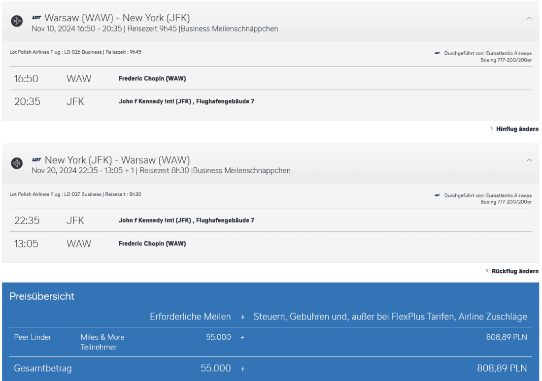 Die LOT-Meilenschnäppchen punkten durch die niedrigen Steuern & Gebühren. Statt fast 1.000€ für Business-Flüge mit der Lufthansa werden gerade einmal 809 PLN (~190 €) an Steuern & Gebühren fällig. Der Reisezeitraum umfasst November und Dezember 2024.
