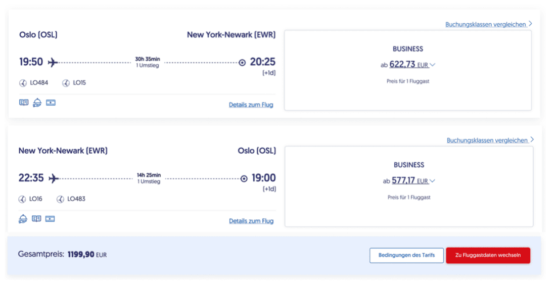 Momentan verkauft LOT günstige Tickets in der Business Class für Flüge von Oslo nach New York (Newark). Einen Hin- und Rückflug könnt ihr im Rahmen des aktuellen Specials bereits ab 1.200€ buchen. Verfügbarkeiten gibt es im Reisezeitraum von Dezember 2024 bis Juni 2025. Auf dem Hinflug ist leider aufgrund des späten Zubringerfluges von Oslo nach Polen eine Übernachtung in Warschau notwendig.