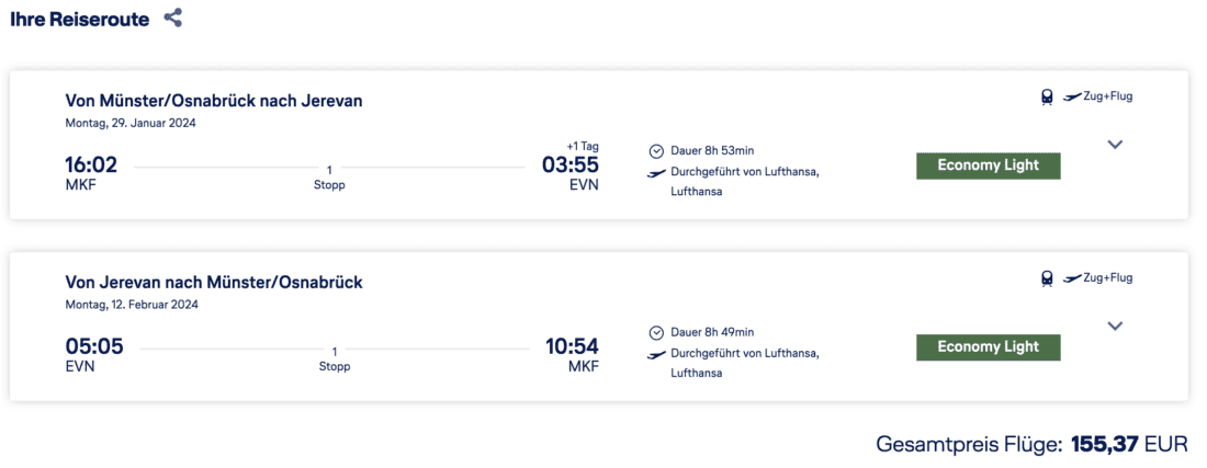 Aktuell gibt es preiswerte Flüge nach Armenien mit der Lufthansa ab einigen deutschen Städten. Die Hauptstadt Jerewans in der gebirgigen Kaukasusregion erreicht ihr dabei ab 156€. Reisen könnt ihr zwischen Januar und April 2024. Für Aufgabegepäck werden bei Buchung des Tarifs Economy Classic insgesamt 60€ Aufpreis fällig.