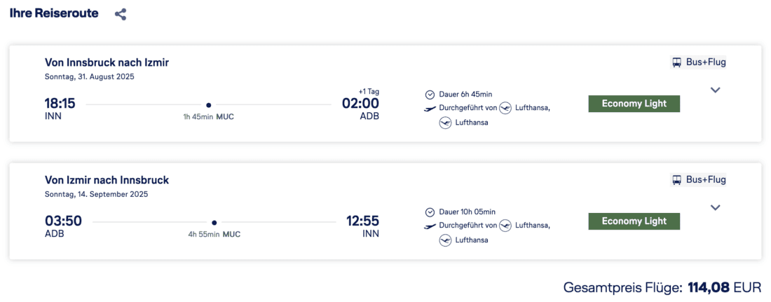 Aktuell verkauft die Lufthansa an ausgewählten Daten günstige Tickets von Innsbruck ins türkische Izmir. Den Hin- und Rückflug könnt ihr momentan ab 114€ buchen. Der Preis beinhaltet 8 kg Handgepäck. Falls ihr mehr benötigen solltet, könnt ihr alternativ den Tarif Economy Classic mit 23 kg Aufgabegepäck sowie einer Sitzplatzreservierung für insgesamt 60€ Aufpreis buchen. Verfügbarkeiten gibt es im Reisezeitraum von Juli bis September 2025 und dementsprechend auch während der Sommerferien.