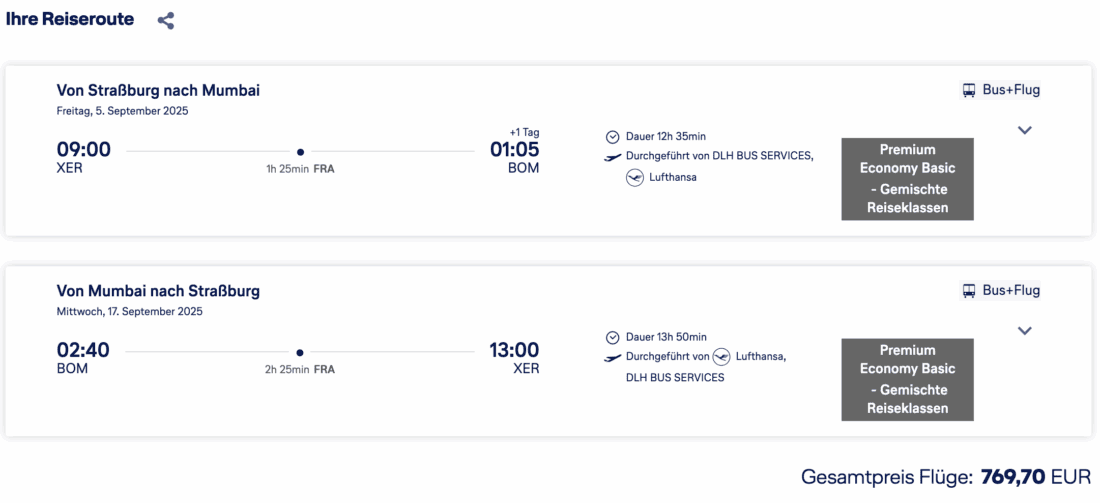 Die Lufthansa bietet aktuell Tickets für Premium Economy Flüge nach Indien reduziert an. Mit Abfahrt von Straßburg bekommt man den Hin- und Rückflug nach Mumbai bereits ab 770€. Dabei fahrt ihr zunächst im Bus nach Frankfurt, von wo aus ihr nonstop ans Ziel gelangt. Günstige Verfügbarkeiten findet ihr für Reisen von Juni 2025 bis März 2026.