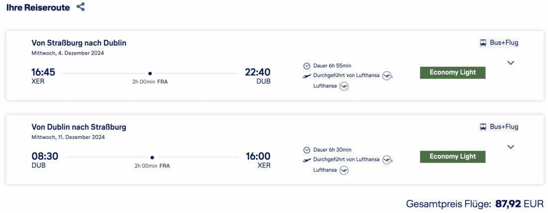Passende Termine findet ihr in diesem Fall nicht mithilfe von Google Flights, da die entsprechenden Kombinationen mit dem Buszubringer ab Straßburg dort nicht angezeigt werden. Orientiert euch daher bei der Suche am besten an der Liste mit den Beispieldaten oben oder nutzt die Lufthansa-Bestpreissuche für den Abflughafen Straßburg. Buchen könnt ihr anschließend ebenfalls direkt bei der Lufthansa.
