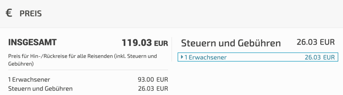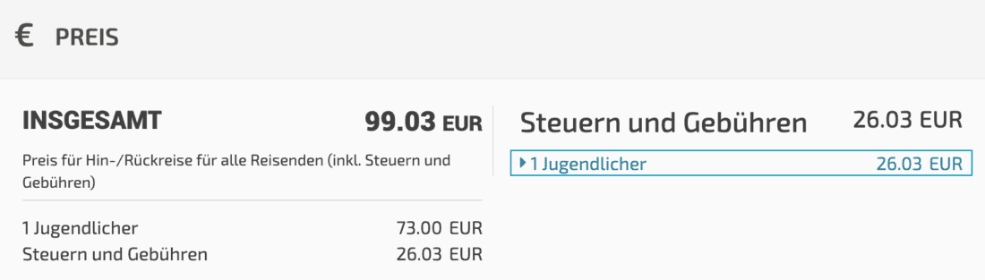 Im Vergleich dazu seht ihr nachfolgend die Preisauflistung bei Buchung der identischen Flüge für einen Erwachsenen: