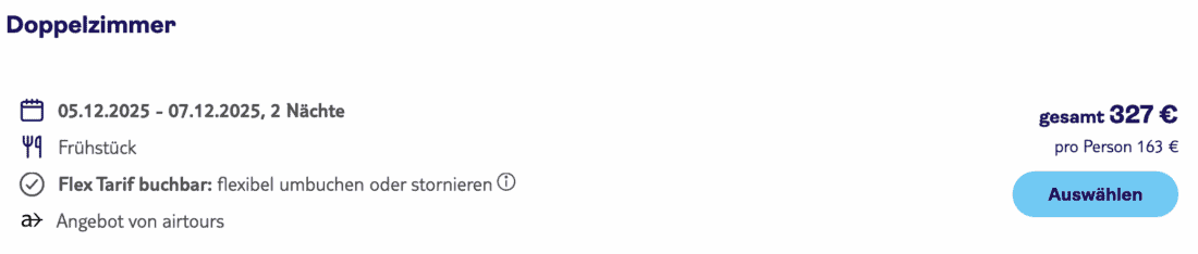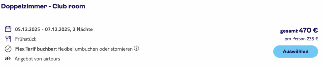 Noch deutlicher wird die Ersparnis, wenn man das günstigste Zimmer mit Zugang zur Club Signatur Lounge heranzieht. In diesem Fall werden über TUI für 2 Übernachtungen vom 5. bis 7. Dezember 2025 470€ verlangt: