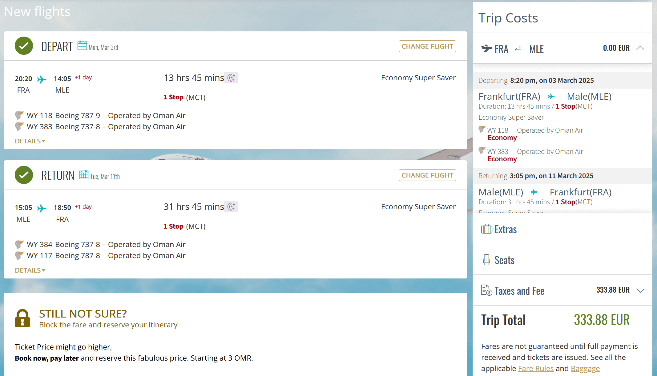 Von Frankfurt fliegt ihr in einer Boeing 787 nach Maskat und dann weiter nach Male in einer Boeing 737MAX. Von München werden alle Segmente mit einer Boeing 737MAX absolviert. Die Beinfreiheit beträgt mindestens 76 Zentimeter. Beachtet, dass ihr auf dem Rückweg stets einen langen Layover habt.