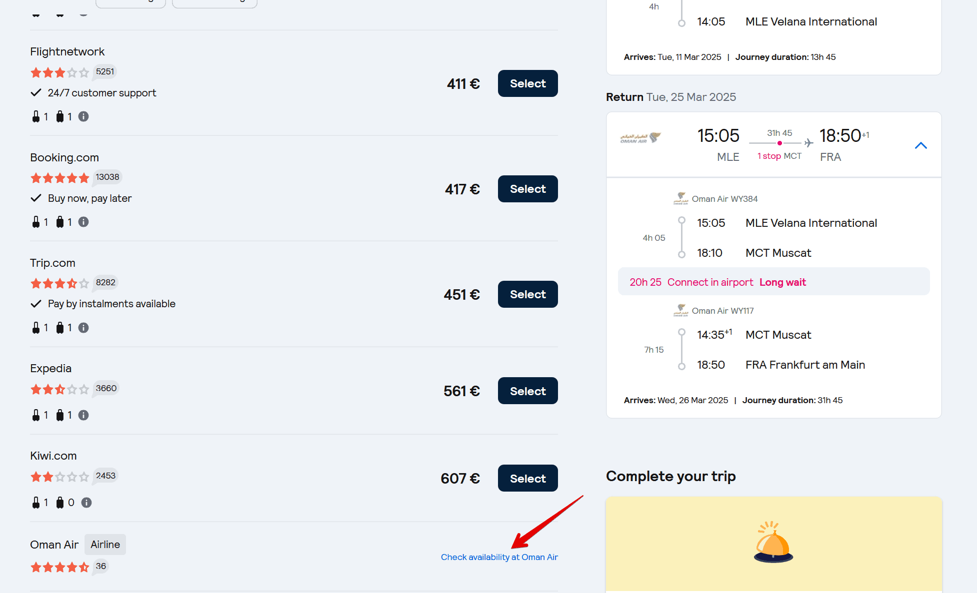 Beachtet, dass Skyscanner euch zunächst höhere Preise anzeigt. Lasst ihr euch dann direkt zu Oman Air weiterleiten (siehe Screenshot weiter unten), sind die genannten Preise verfügbar: