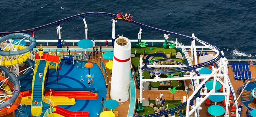Die Mardi Gras bietet an Bord besonders viele Attraktionen. Der wichtigste Treffpunkt ist das Atrium mit dem Bereich „Grand Central“. Hier befinden sich auf drei Decks mehrere Cafés und Bars, dazu gibt es Live-Musik. In Anlehnung an New Orleans ist auf dem Schiff sogar ein Jazz-Club zu finden. Für Spaß und Action sorgt die Zone namens „The Ultimate Playground“. Dort gibt es die erste Achterbahn auf einem Schiff sowie einen Wasserpark und Minigolfplatz.