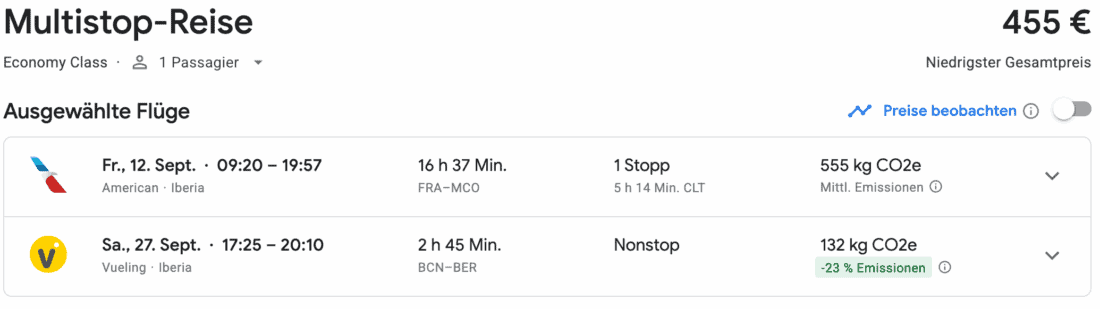 Die Kreuzfahrt startet in Port Canaveral und endet in Barcelona. Entsprechende Gabelflüge gibt es mit American Airlines, Iberia und Vueling momentan ab 455€ (zzgl. ca. 70€ für Aufgabegepäck). Dabei erfolgt der Hinflug am 12. September von Frankfurt nach Orlando und der Rückflug am 27. September 2025 von Barcelona nach Berlin: