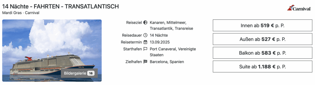 Mit dem Kreuzfahrtschiff Mardi Gras der US-Reederei Carnival Cruises könnt ihr im September 2025 sehr günstig einmal den Atlantik überqueren. Dabei geht es von Port Canaveral in Florida nach Barcelona und ihr zahlt für 14 Nächte in einer Innenkabine momentan lediglich 519€ 386€ pro Person. Es kommt aber noch besser, denn auch die Außenkabinen ab 527€ sowie die Balkonkabinen ab 583€ werden zu exzellenten Preisen angeboten (jeweils pro Person bei Doppelbelegung). Alleinreisende können sich dieses Angebot ab 707€ in einer Innenkabine sichern.