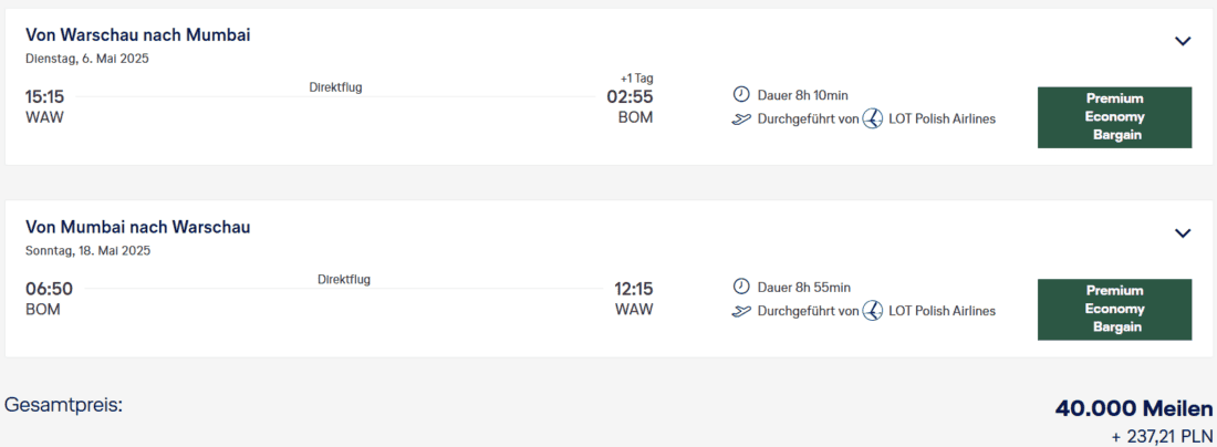 Was Swiss, Lufthansa und Co angeht, ist der März anscheinend ein Reinfall. Dafür gibt es einen vergleichsweise attraktiven Deal von LOT. Wenn euch die Premium Economy reicht, gibt es einen Hin- und Rückflug von Warschau nach Mumbai, Indien für nur 40.000 Meilen zzgl. 238 PLN (~56 €) an Zuschlägen.