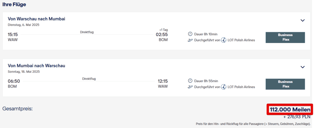 Eigentlich sollte auch ein Meilenschnäppchen in der Business Class verfügbar sein. Ein Roundtrip würde dann 55.000 Meilen und 277 PLN (~65 €) Zuschläge kosten.