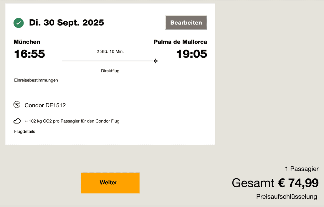 Falls ihr lieber individuell an- und abreisen möchtet, so gibt es viele Varianten. Eine günstige Möglichkeit für den Flug nach Mallorca ist die Direktverbindung mit Condor am 30. September 2025 von München, welche ihr ab 75€ (zzgl. 20€ für 20 kg Aufgabegepäck buchen könnt):