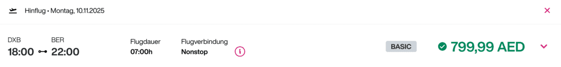 Für den Rückflug von Dubai könnt ihr etwa die Direktverbindung mit Eurowings am 10. November 2025 nach Berlin nutzen, die ihr ab 800 AED (~187 €) (zzgl. 120 AED (~28 €) für 23 kg Aufgabegepäck) buchen könnt: