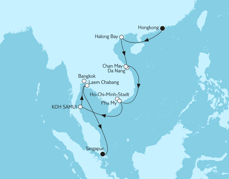 Die Mein Schiff 5 fährt im April 2023 von Hongkong nach Singapur und aktuell gibt es diese 15-tägige Kreuzfahrt zu durchaus fairen Konditionen. Die Innenkabine erhaltet ihr für 999€, die Außenkabine ab 1.199€ und die Balkonkabine ab 1.399€ – jeweils pro Person. Alleinreisende sind ab 1.598€ dabei.
