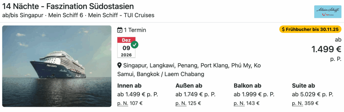 Mein Schiff hat ein ordentliches Frühbucherangebot in petto. Im Winter 2026/2027 gibt es mehrere 15-tägige Kreuzfahrten von Singapur aktuell zu fairen Preisen. Die Innenkabine erhaltet ihr ab 1.499€, die Außenkabine ab 1.749€ und die Balkonkabine ab 1.999€ – jeweils pro Person. Alleinreisende zahlen leider fast das Doppelte und sind erst ab 2.938€ dabei.
