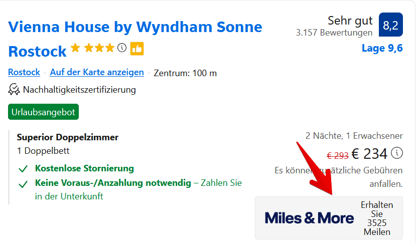 Um die Meilen zu erhalten, müsst ihr über die Aktionsseite bei Booking.com bzw. bei Miles&More buchen. Der Meilenbonus wird dann direkt angezeigt: