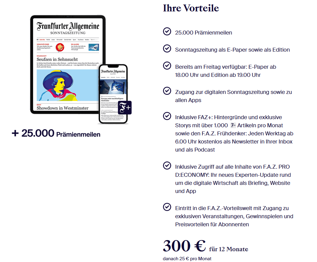 Bei Miles&More bietet sich aktuell wieder eine Gelegenheit, günstig Meilen mit einem Zeitungs-Abo zu „kaufen“. Ein Digitalabo der Frankfurt Allgemeinen Sonntagszeitung kommt mit 25.000 Meilen daher und kostet 300€ für 12 Monate. So ergibt sich ein Preis von guten 1,2 Cent pro Meile.