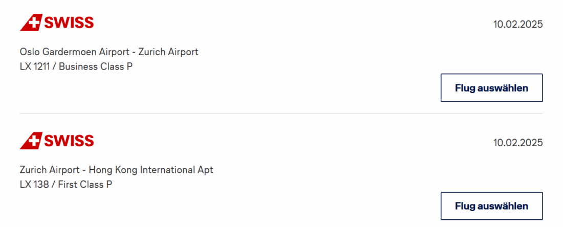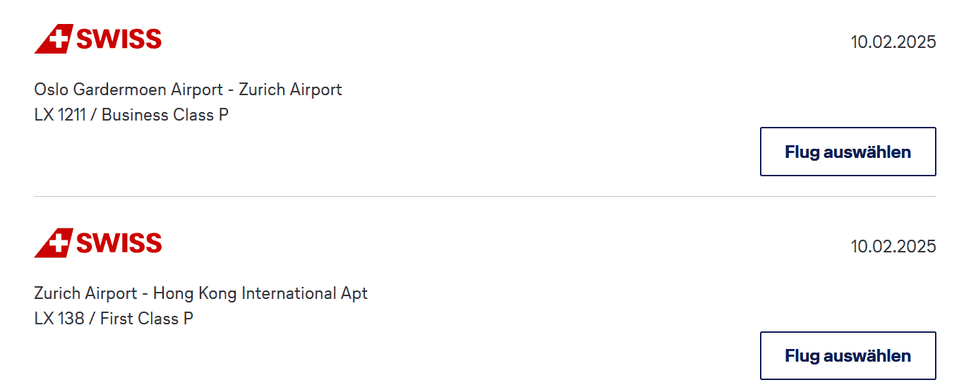 • Swiss Business Class Oslo – Zürich (oneway, nachträglich):