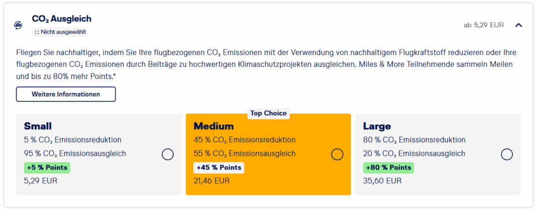 Stattdessen musst du zuerst den Buchungsprozess bis zu den persönlichen Daten durchspielen und erst dann eines der CO2-Pakete auswählen.