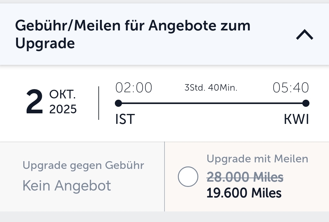 Wenn die Bedingungen erfüllt sind, wird beim Versuch des Upgrades automatisch der reduzierte Preis angezeigt. Zum Beispiel hier für die Strecke Istanbul – Kuwait: