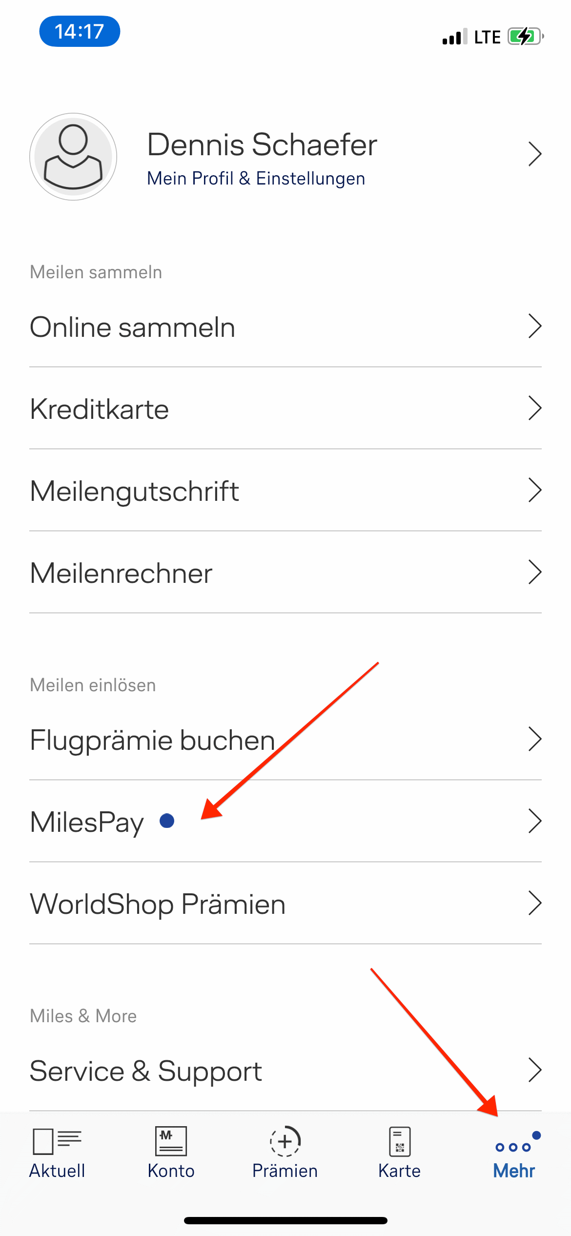 Zunächst braucht ihr die neueste Version der Miles&More-App. Wir haben die App jeweils mit iPhones und Android-Telefonen getestet und können bestätigen, dass es keine Probleme gibt. Dort findet ihr dann unter dem Reiter Mehr die neue Funktion MilesPay.