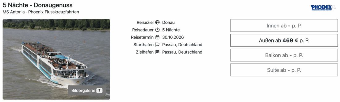Die MS Antonia der Reederei Phoenix Reisen wird im Herbst und Winter 2026 an verschiedenen Terminen ab Passau für Flusskreuzfahrten auf der Donau eingesetzt. Dabei erwarten euch im Routenverlauf die europäischen Hauptstädte Wien, Budapest und Bratislava. 5 Nächte in einer Außenkabine sind bereits ab 469€ pro Person buchbar. Alleinreisende zahlen 869€. Dabei handelt es sich um Frühbucherpreise, die bis einschließlich 30. September 2025 buchbar sind.