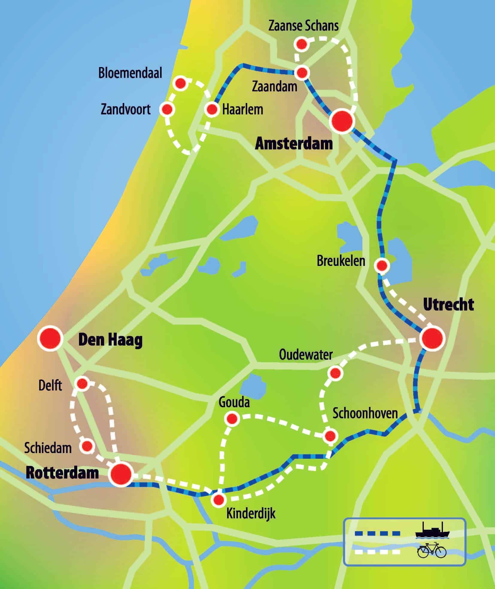 - Tag 2: Amsterdam – Breukelen (per Schiff), Breukelen – Utrecht (per Rad), Utrecht-Rotterdam (per Schiff)