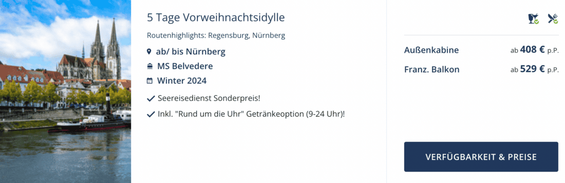 Die MS Belvedere von Nicko Cruises ist in der Vorweihnachtszeit an vier Terminen im Dezember auf dem Main-Donau-Kanal zwischen Nürnberg und Regensburg im Einsatz. Aktuell könnt ihr euch beim Seereisedienst diese Flusskreuzfahrt bereits ab 408€ pro Person in einer Außenkabine sichern. Ebenfalls verfügbar sind Kabinen mit französischem Balkon ab 529€ pro Person.