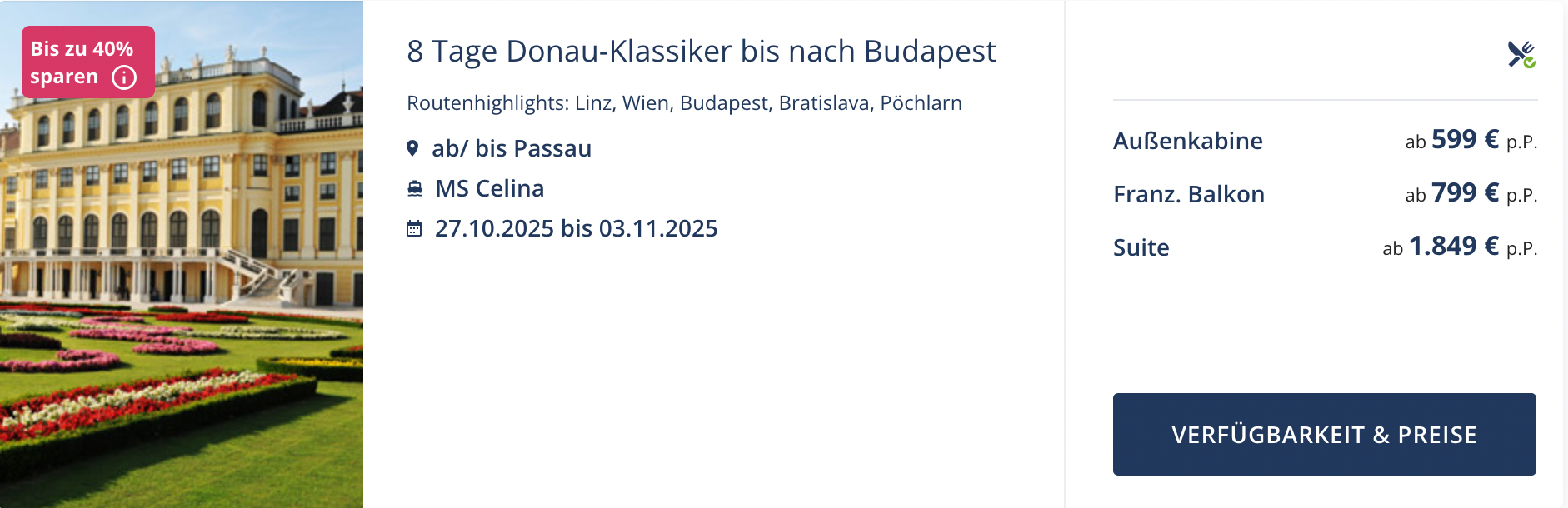 Die MS Celina der Reederei Nicko Cruises startet Ende Oktober 2025 ab Passau zu einer Flusskreuzfahrt auf der Donau. Falls ihr also zeitlich flexibel seid, könnt ihr diese Reise jetzt beim Seereisedienst zum Sonderpreis sichern. Eine Außenkabine ist bereits ab 599€ pro Person buchbar. Außerdem könnt ihr euch für eine Kabine mit französischem Balkon ab 799€ pro Person entscheiden. Für Alleinreisende werden leider mindestens 1.104€ fällig.