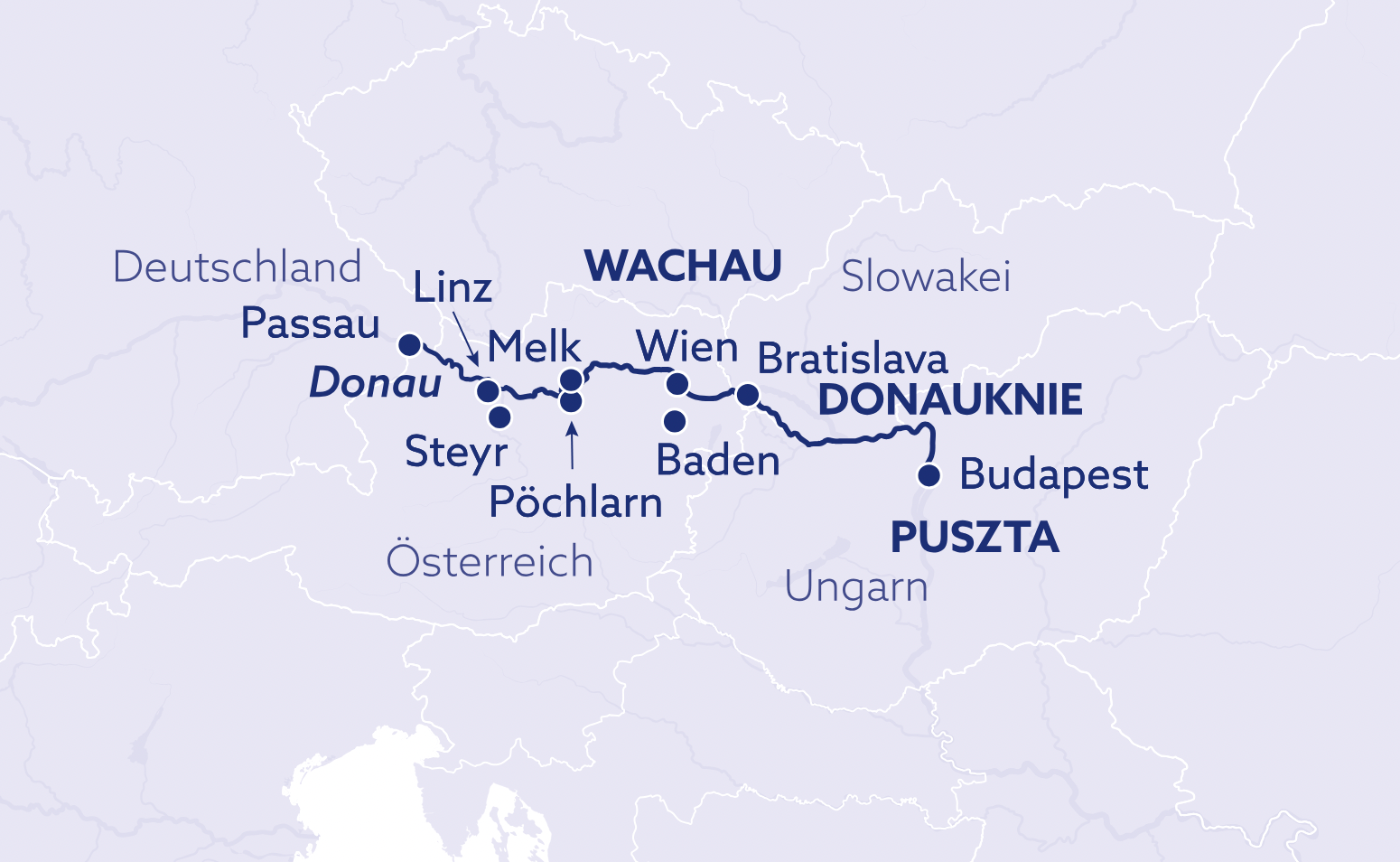Danach fährt die MS Celine in die slowakische Hauptstadt Bratislava. Die historische Altstadt bietet viele Sehenswürdigkeiten, wie etwa das Rathaus, das Nationaltheater oder das Michaelertor. Die Burg von Bratislava ist ebenfalls ein wichtiges Ausflugsziel. Über Pöchlarn geht es wieder zurück nach Passau, wo die Kreuzfahrt nach einer Woche endet.