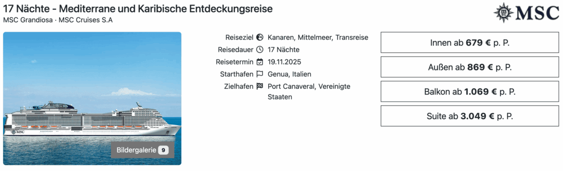 Im November 2025 verlässt die MSC Grandiosa das Mittelmeer und fährt nach Florida. Dort wird das Schiff dann in der kommenden Wintersaison für Kreuzfahrten in die Karibik sowie auf die Bahamas eingesetzt. Ihr könnt euch momentan die Positionierung von Genua nach Port Canaveral (bei Orlando) mit einer Dauer von 17 Nächten zu attraktiven Preisen sichern.