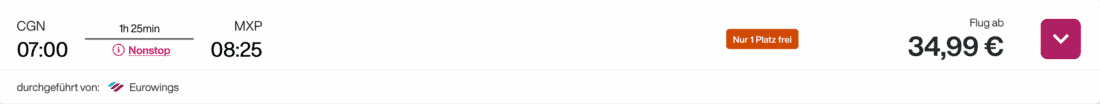 Diese Kreuzfahrt startet in Genua und endet in Port Canaveral (ca. 85 Kilometer von Orlando entfernt). Daher sind hier zwei Oneway-Flüge für die An- und Abreise erforderlich. Einen günstigen Hinflug gibt es beispielsweise am 17. November 2025 mit Eurowings von Köln nach Mailand. Dieser Flug ist aktuell schon ab 35€ (zzgl. 22€ für 23 kg Aufgabegepäck) buchbar: