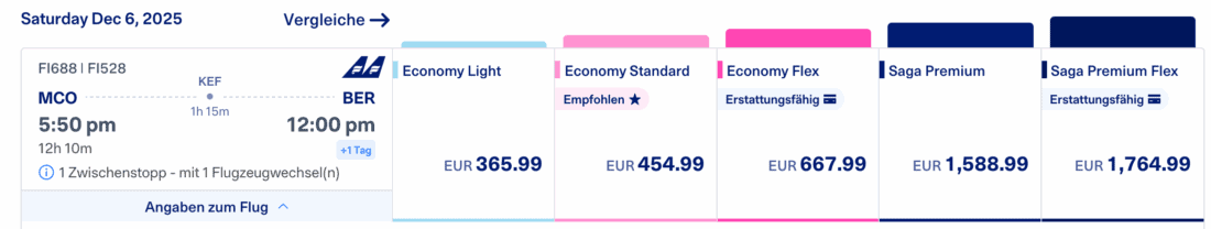 Nach Ankunft in Port Canaveral gibt es zahlreiche Optionen für euren Rückflug von Orlando. Ein Beispiel ist die Verbindung mit Icelandair nach Berlin am 6. Dezember 2025. Diese ist momentan ab 366€ (zzgl. 89€ für Aufgabegepäck und Sitzplatzreservierung) buchbar: