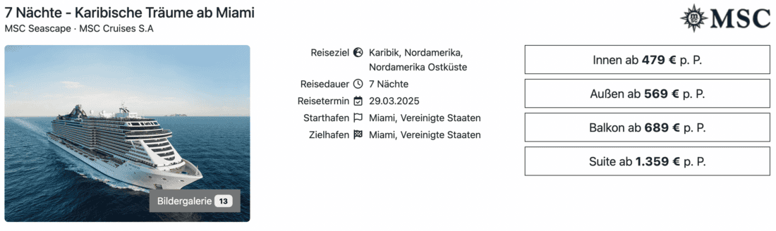 Die MSC Seascape wird momentan auf verschiedenen Kreuzfahrten in der Karibik eingesetzt und fährt dabei zu mehreren Inseln, auf denen ihr dem tristen Winterwetter hierzulande einfach entfliehen könnt. Aktuell wird die Abfahrt Ende März 2025 von Miami zu besonders günstigen Preisen angeboten. Für 7 Nächte in der Innenkabine zahlt ihr lediglich 479€ pro Person.