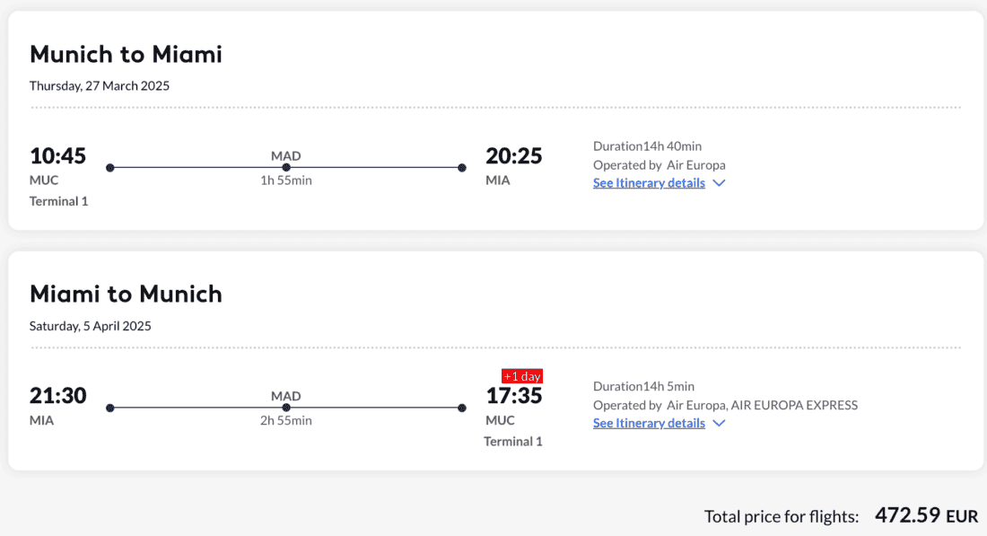 Die Kreuzfahrt startet und endet in Miami. Für die An- und Abreise gibt es verschiedene Optionen. Als Beispiel können wir euch Flüge mit Air Europa von München über Madrid empfehlen. Mit Hinflug am 27. März und Rückflug am 5. April 2025 könnt ihr diese Kombination bereits ab 473€ (zzgl. 100€ für 23 kg Aufgabegepäck) buchen: