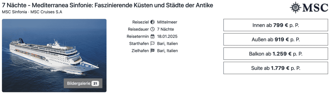 Die MSC Sinfonia verbringt diese Wintersaison im Mittelmeer und die Einschiffung ist dabei jeweils in verschiedenen Abfahrtshäfen möglich. Aktuell könnt ihr eine einwöchige Kreuzfahrt mit Start in Bari sowie mehreren Zwischenstopps in Italien, Griechenland und der Türkei inkl. Flugpaket der Reederei ab/bis Frankfurt bereits ab 799€ pro Person buchen. Weitere Optionen sind die Außenkabinen ab 919€ sowie die Balkonkabinen ab 1.259€ (jeweils pro Person bei Doppelbelegung).