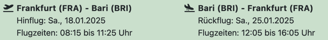Die Kreuzfahrt startet und endet in Bari. Ihr müsst euch bei diesem Angebot nicht selbst um die An- und Abreise kümmern, denn die genannten Preise beinhalten das MSC-Flugpaket ab/bis Frankfurt sowie die Transfers vor Ort zwischen Flughafen und Hafen. Die voraussichtlichen Flugzeiten sind wie folgt: